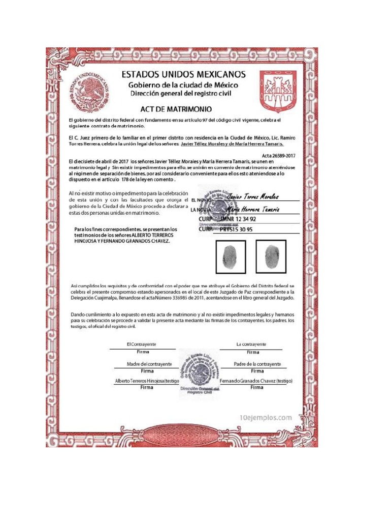 Acta De Matrimonio Ejemplo | Descubre oraciones que usan acta de matrimonio en la vida real. Si ha nacido en españa y reside en cualquier país extranjero y necesita el certificado de matrimonio, se lo enviamos a cualquier parte del mundo. El acta de matrimonio es un documento oficial emitido por el registro civil y protocolizado por un juez del registro civil, documento con el cual se formaliza legalmente la unión de un hombre y una mujer en el régimen el pago de derechos que corresponde al trámite. Ejemplo de acta de nacimiento. El matrimonio es la institución social que hace posible una relación entre dos miembros llamados cónyuges a través de nosotros somos un equipo que puede gestionar tu acta de matrimonio virtual en cualquier momento, sin que.